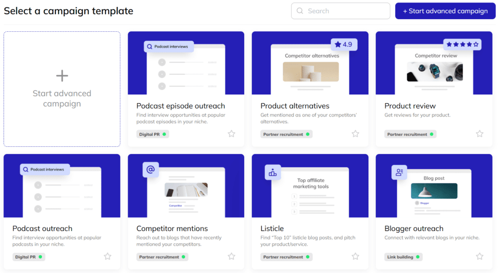 Respona comes with a variety of campaign templates for different link building strategies including: